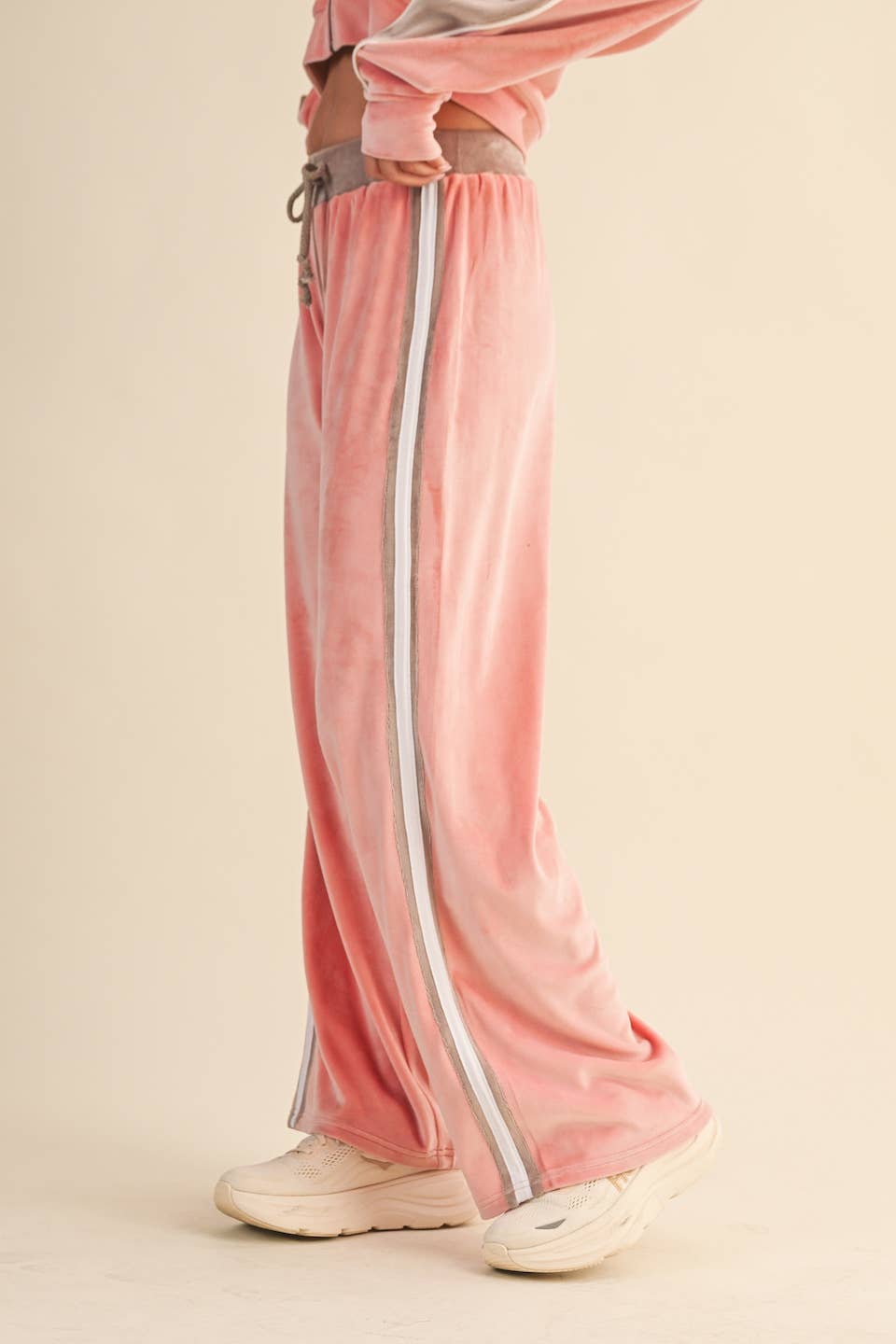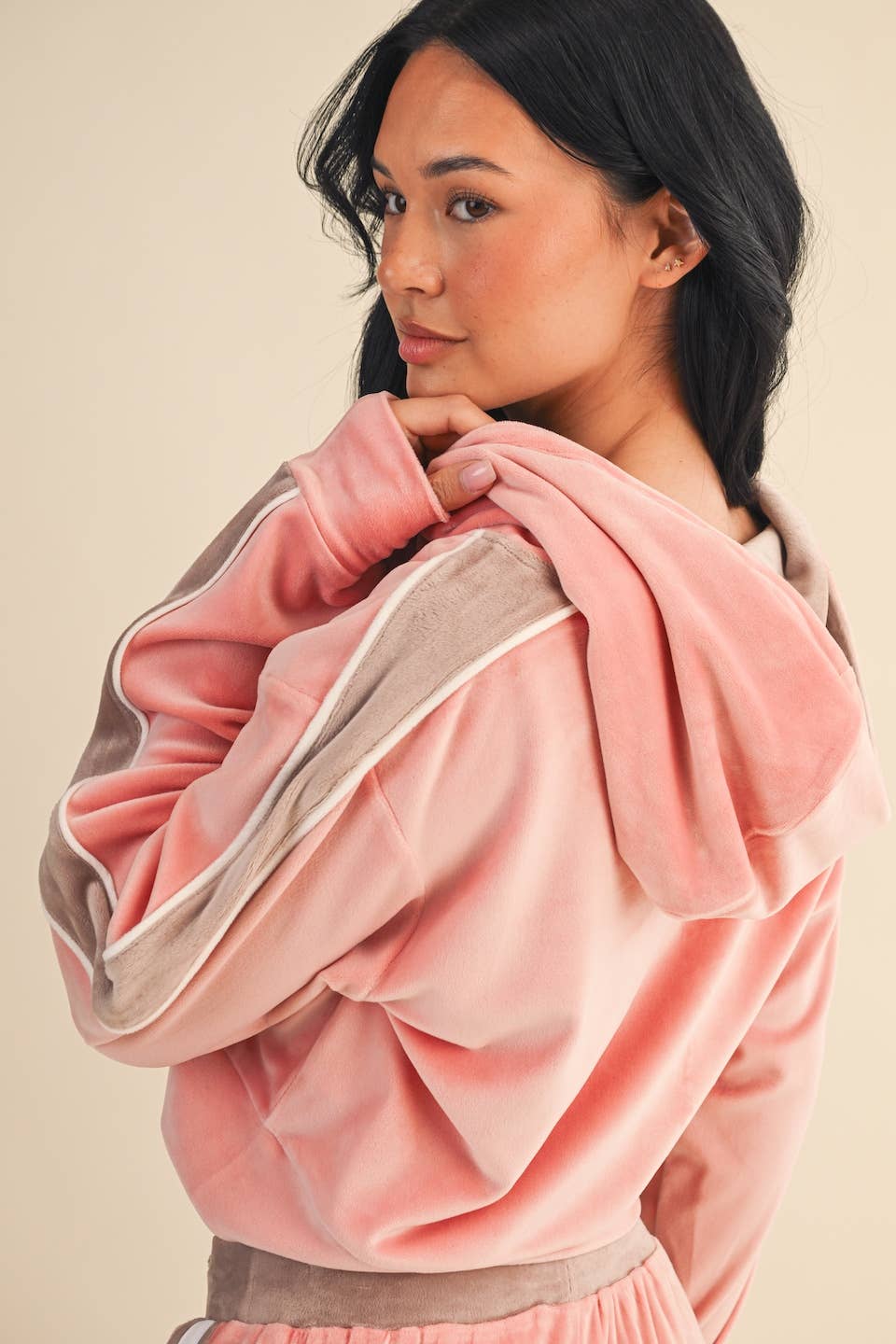 This luxe set features a soft, velvety finish with sporty side stripes for a modern edge. The slightly cropped hoodie with full zip and drawstring joggers create a flattering, laid-back silhouette that’s perfect from lounge to lunch.