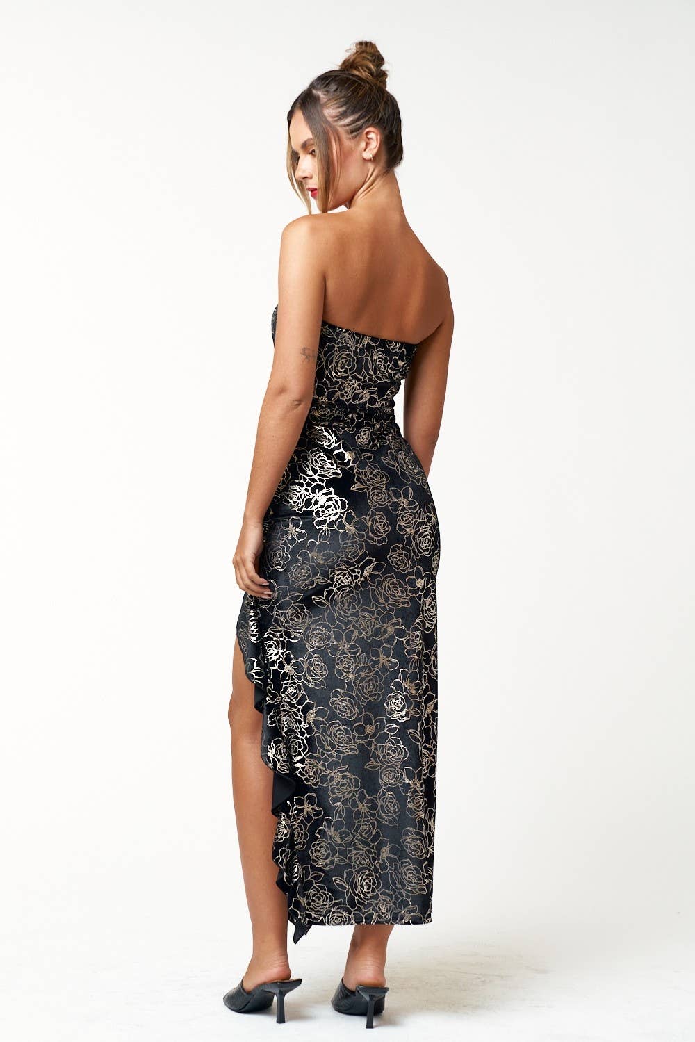 Romantic & Chic: Floral Tube Maxi Dress with Asymmetric Ruffle Detail - Rose Print: Beautiful, feminine floral design - Strapless Neckline: Elegant and flattering - Side Slit: Adds a touch of allure - Asymmetric Detail: Unique and modern look - Ruffle Hem: Playful and flirty finish - Maxi Length: Flowing and graceful silhouette