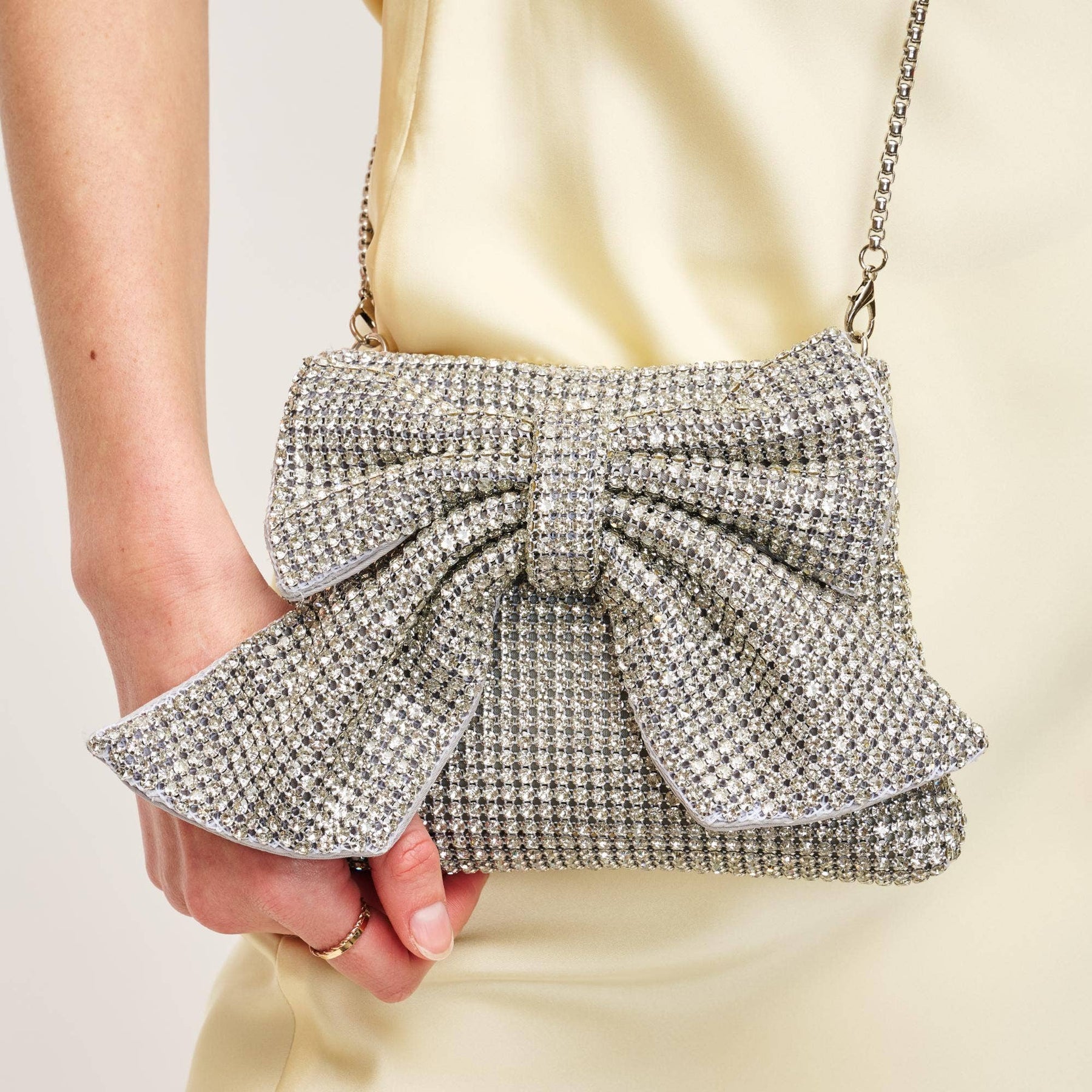 Make a stunning statement with the Gretchen Evening Bag, where elegance meets playfulness. This captivating accessory features a charming bow design, adorned with shimmering detail that reflects your inner glamour.