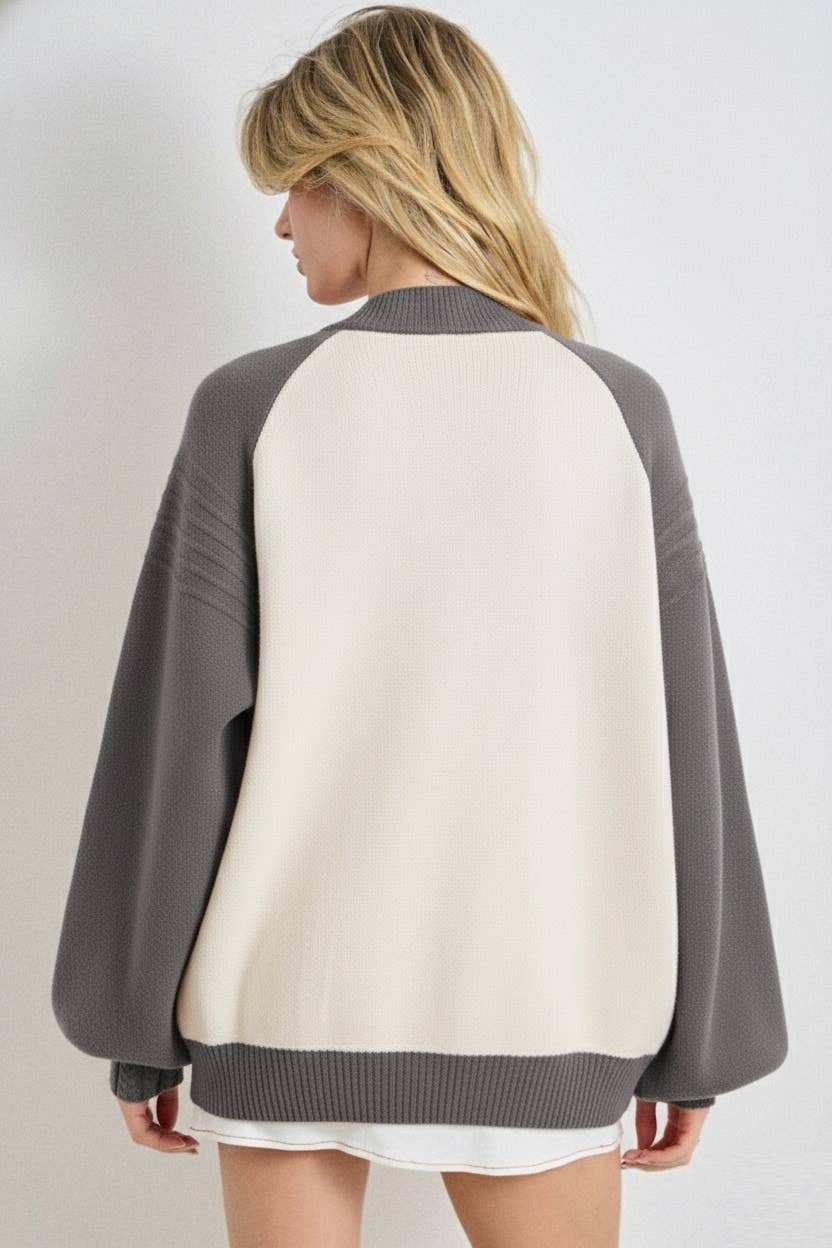 Retro Patch Appliqué Knit Bomber: CREAM/GREY