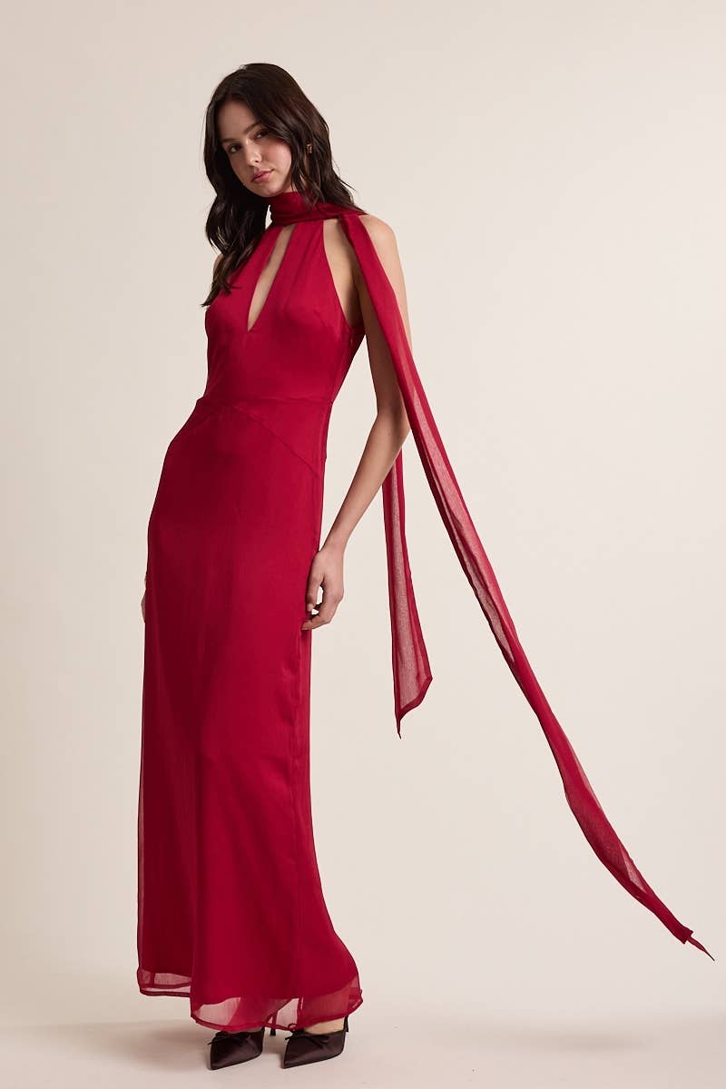 MESH SCARF POINT CUT OUT COCKTAIL MAXI DRESS: